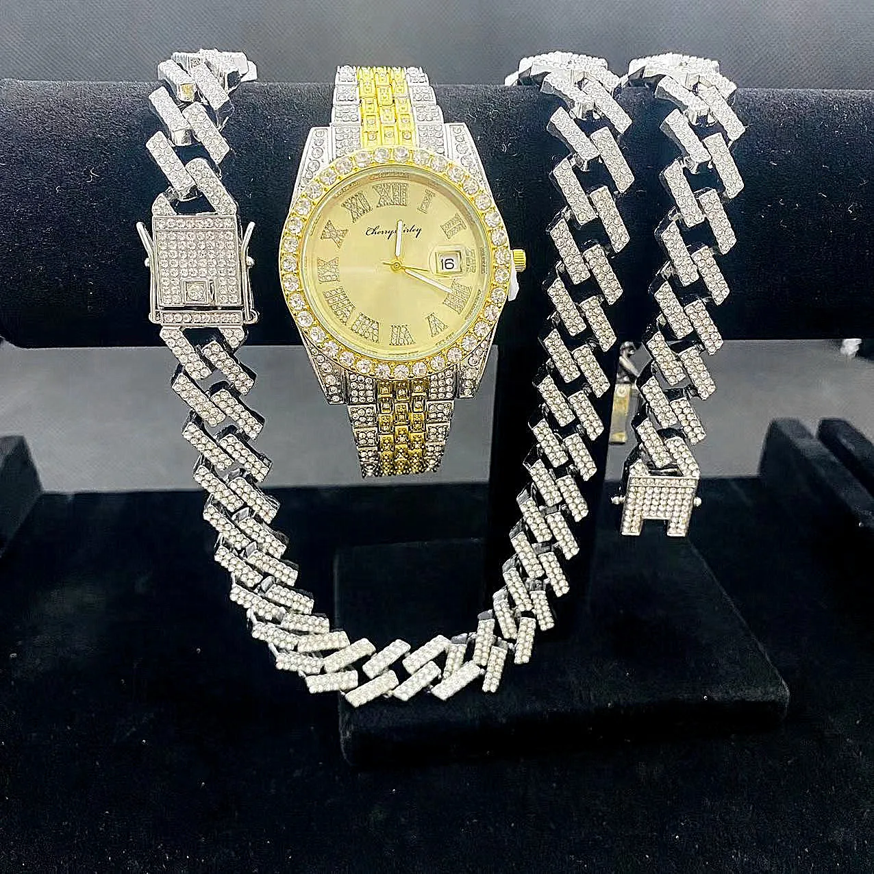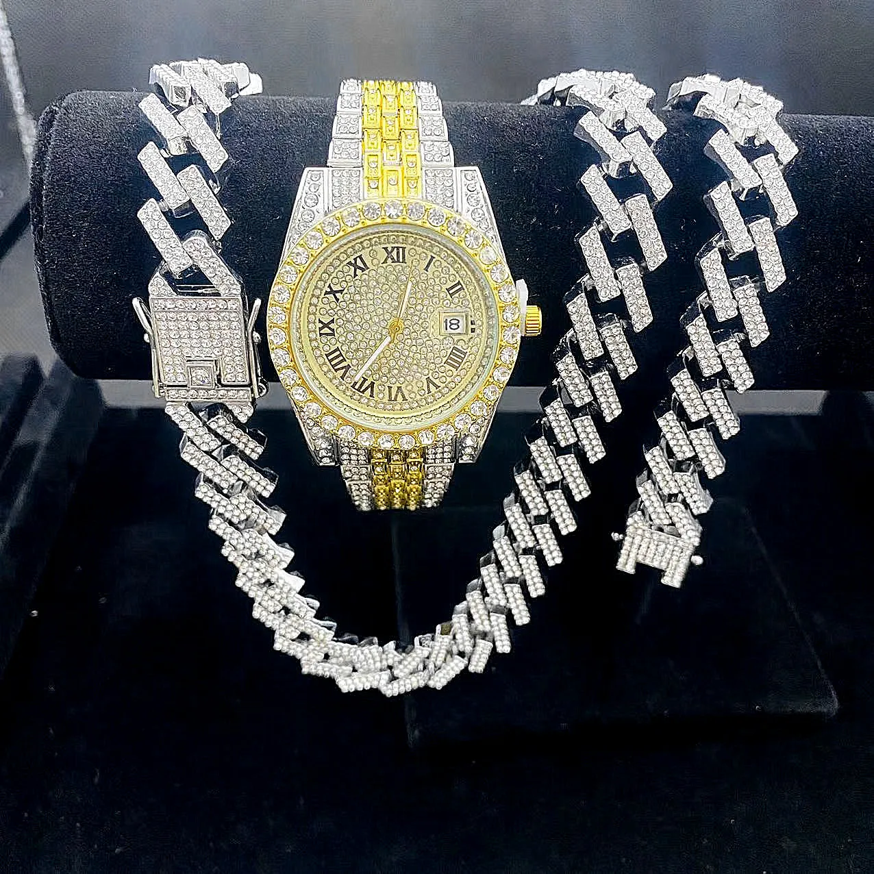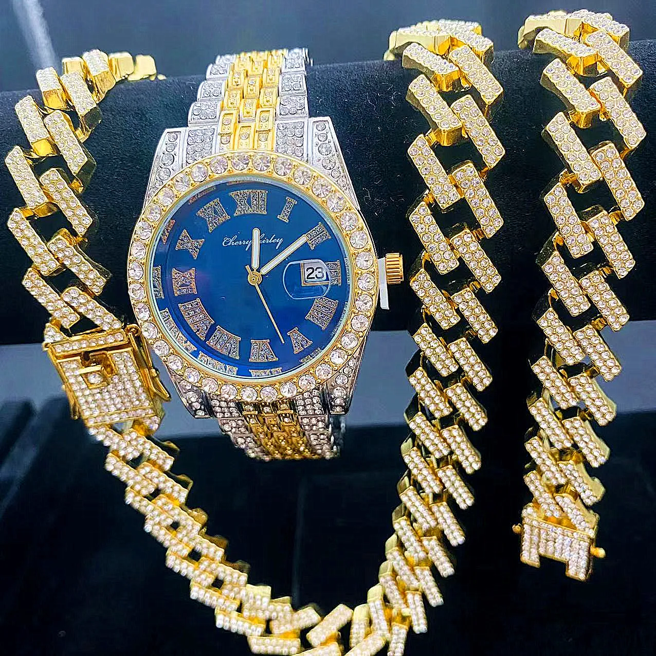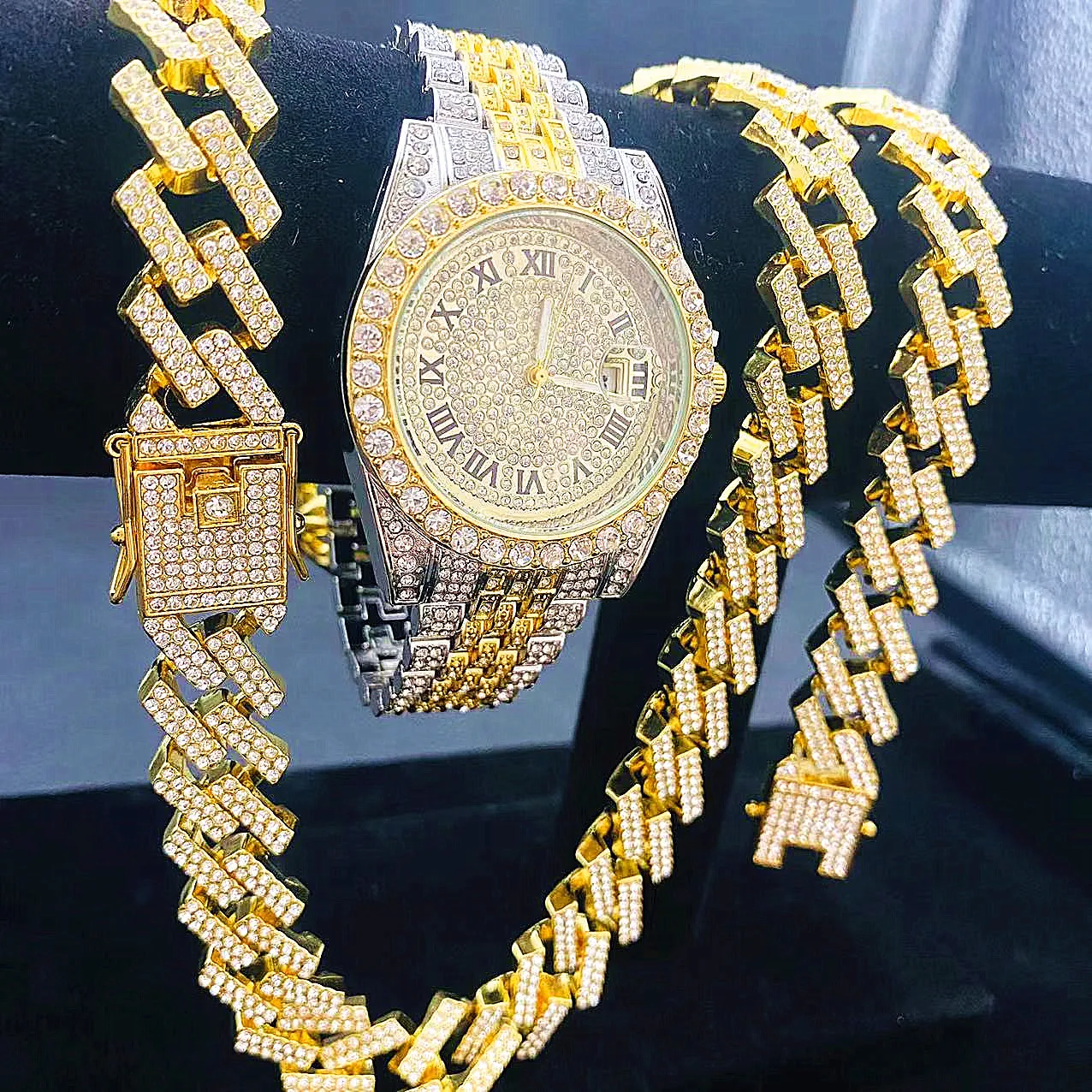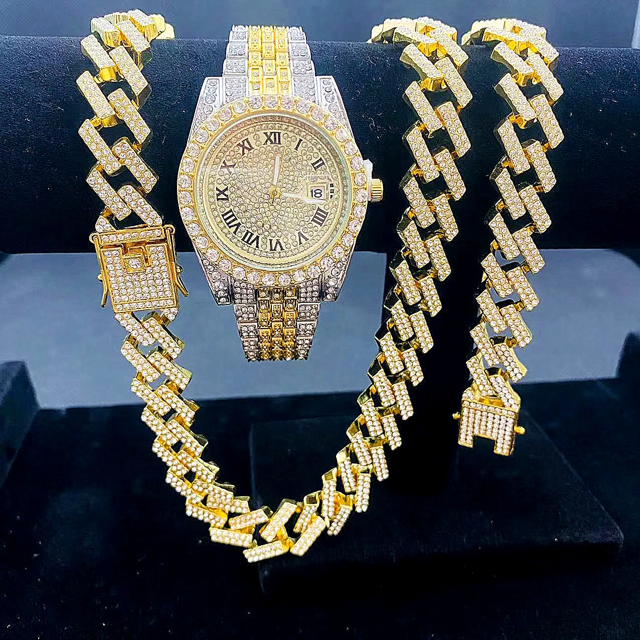 3PCS Iced Out Watches for Men Diamond Gold Watch 15mm Cuban Link Chains Bracelet + Necklaces Jewelry Watch Men Religio Masculino