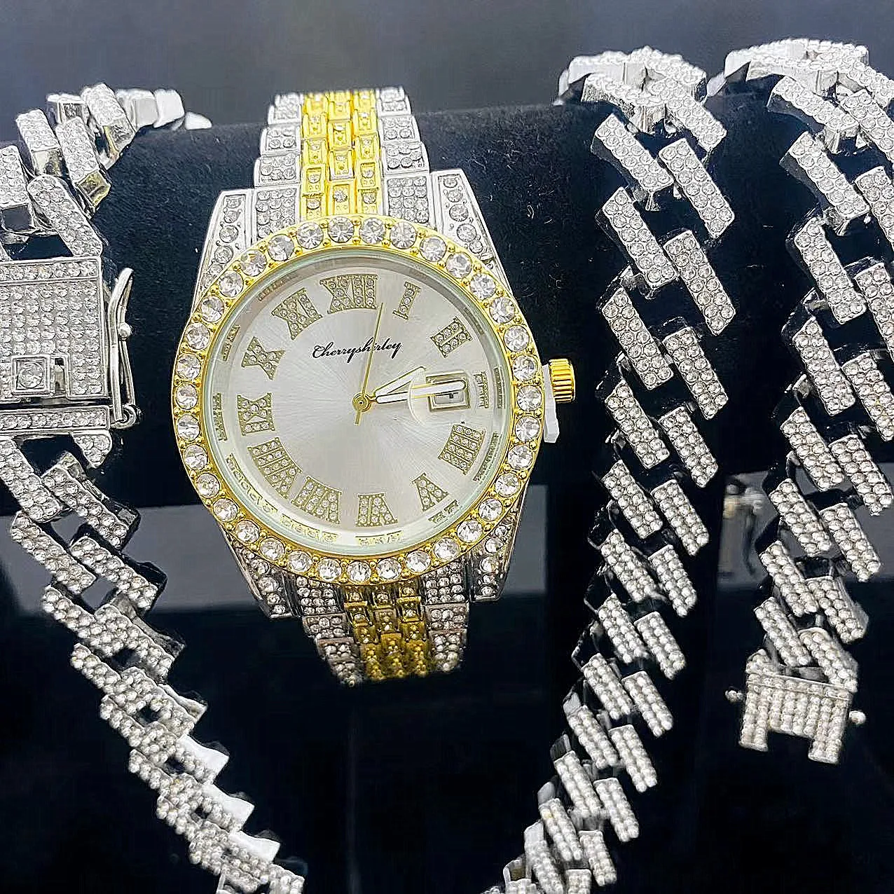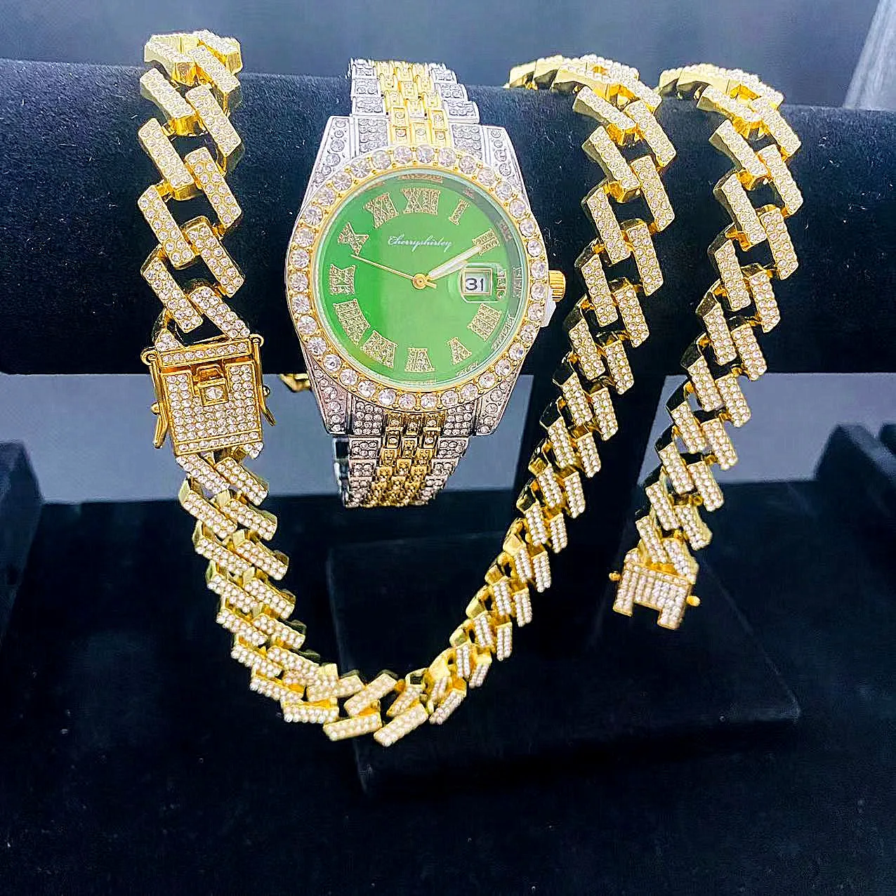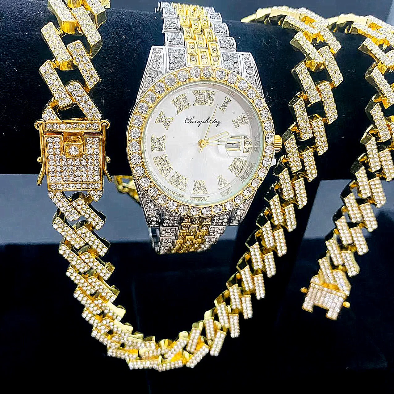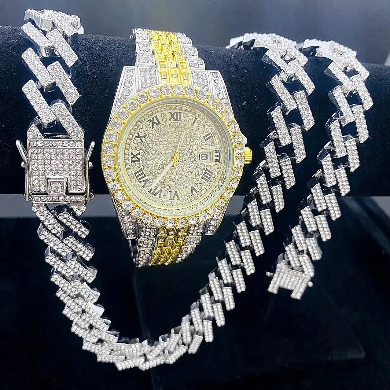 3PCS Iced Out Watches for Men Diamond Gold Watch 15mm Cuban Link Chains Bracelet + Necklaces Jewelry Watch Men Religio Masculino