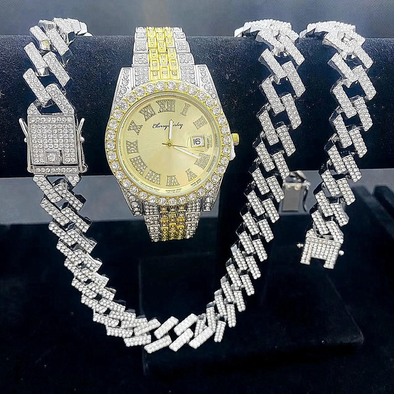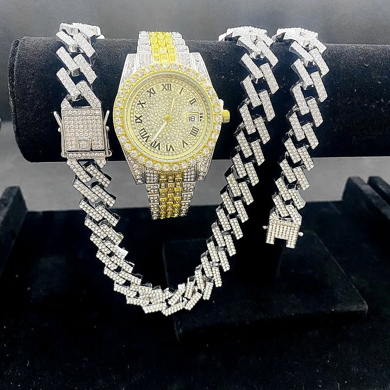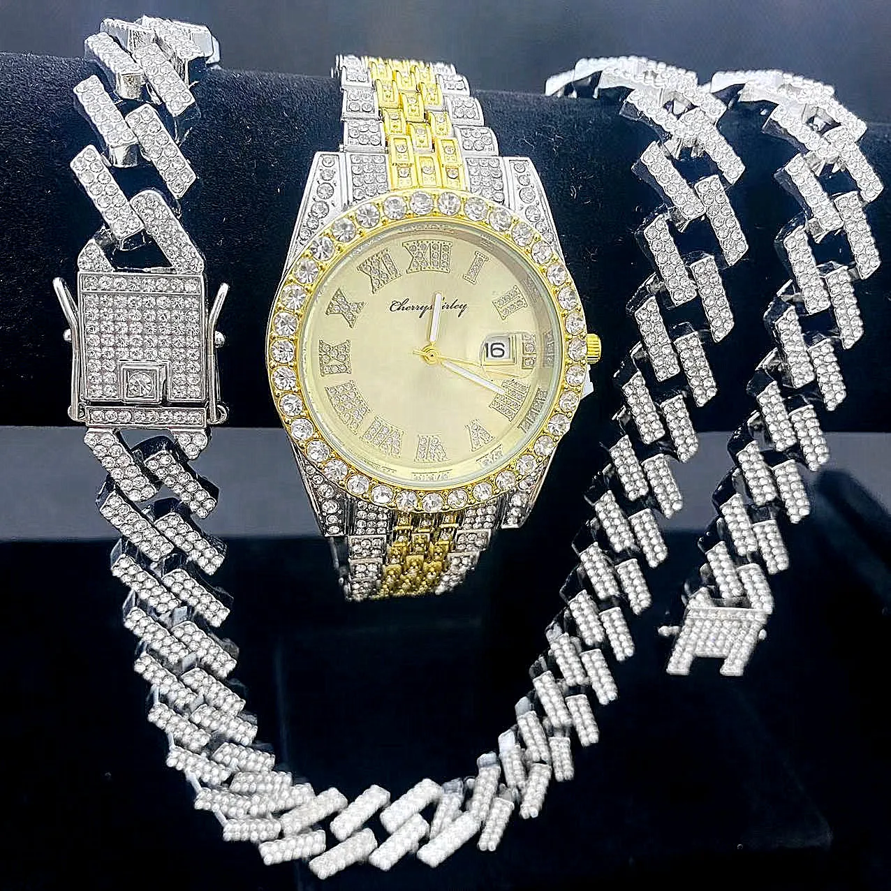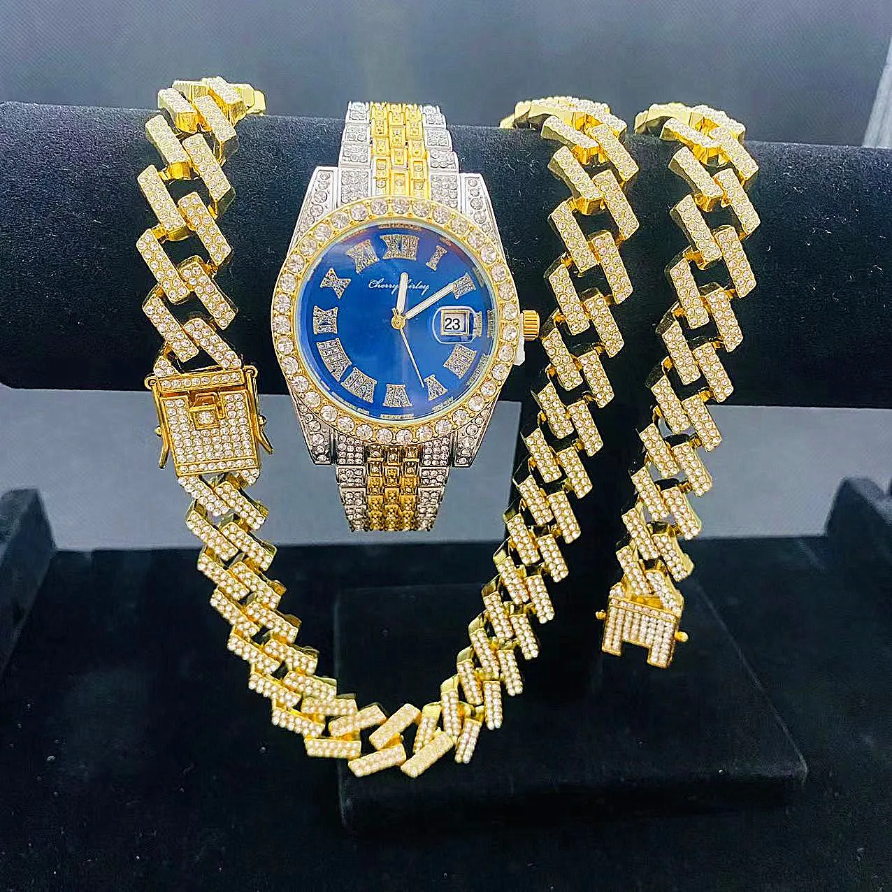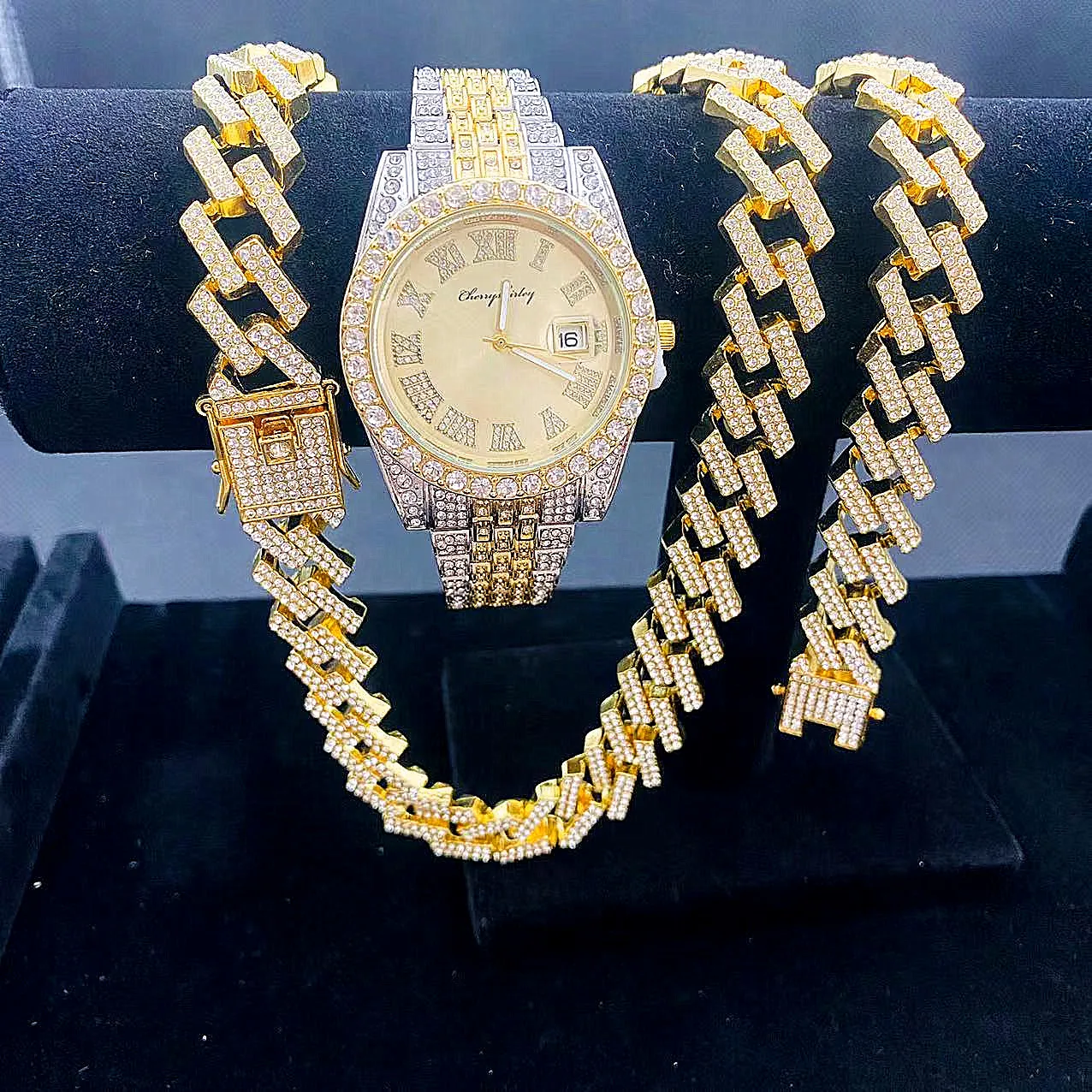 3PCS Iced Out Watches for Men Diamond Gold Watch 15mm Cuban Link Chains Bracelet + Necklaces Jewelry Watch Men Religio Masculino