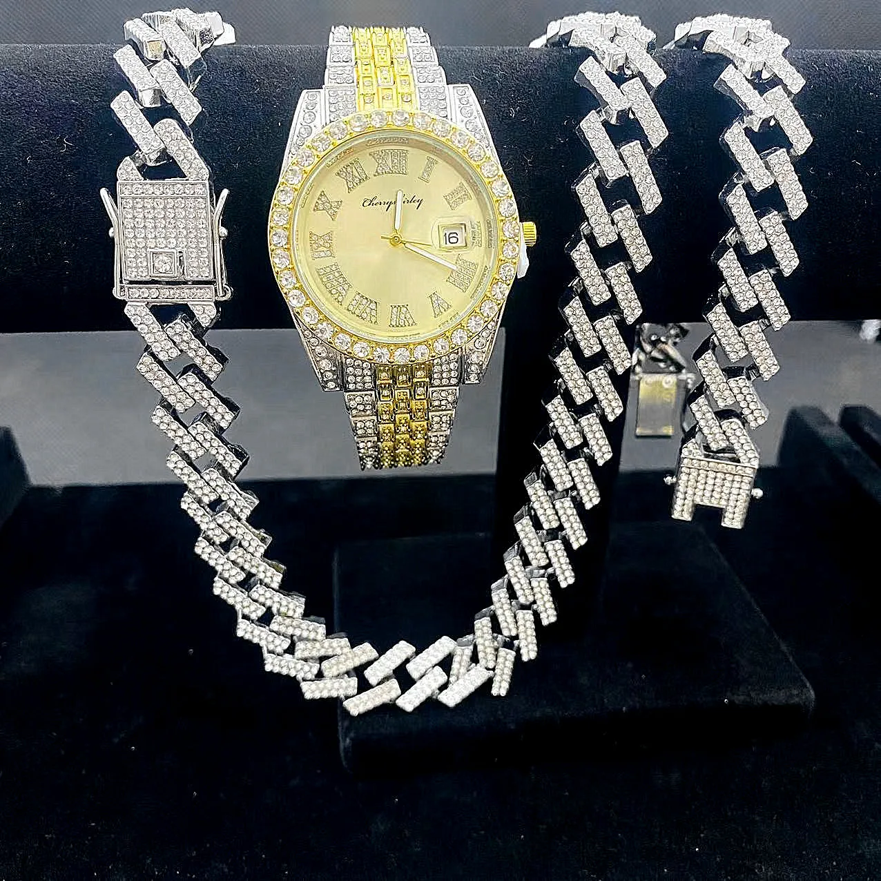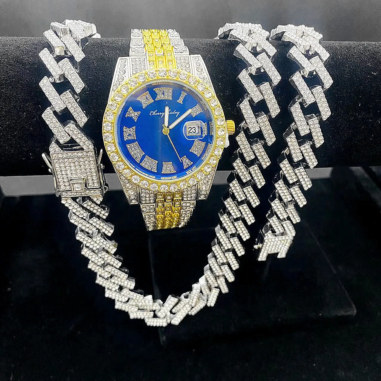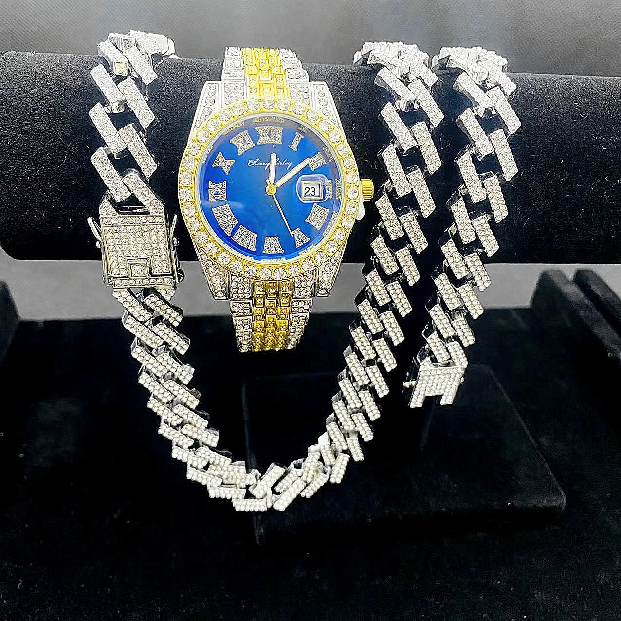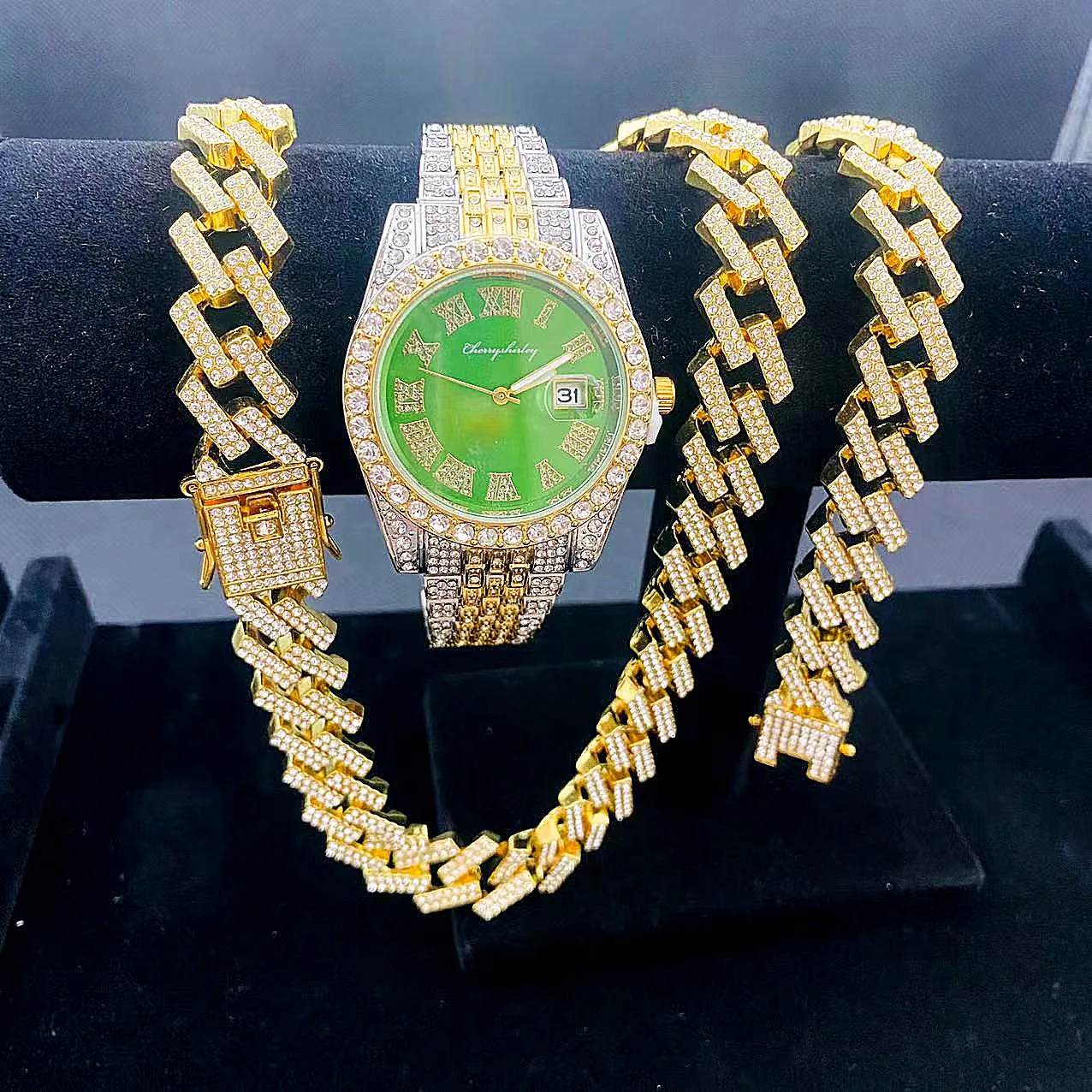3PCS Iced Out Watches for Men Diamond Gold Watch 15mm Cuban Link Chains Bracelet + Necklaces Jewelry Watch Men Religio Masculino