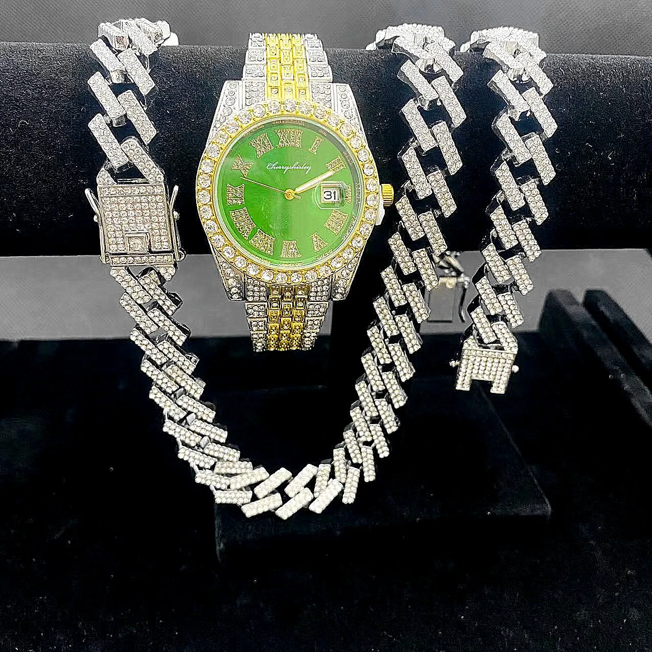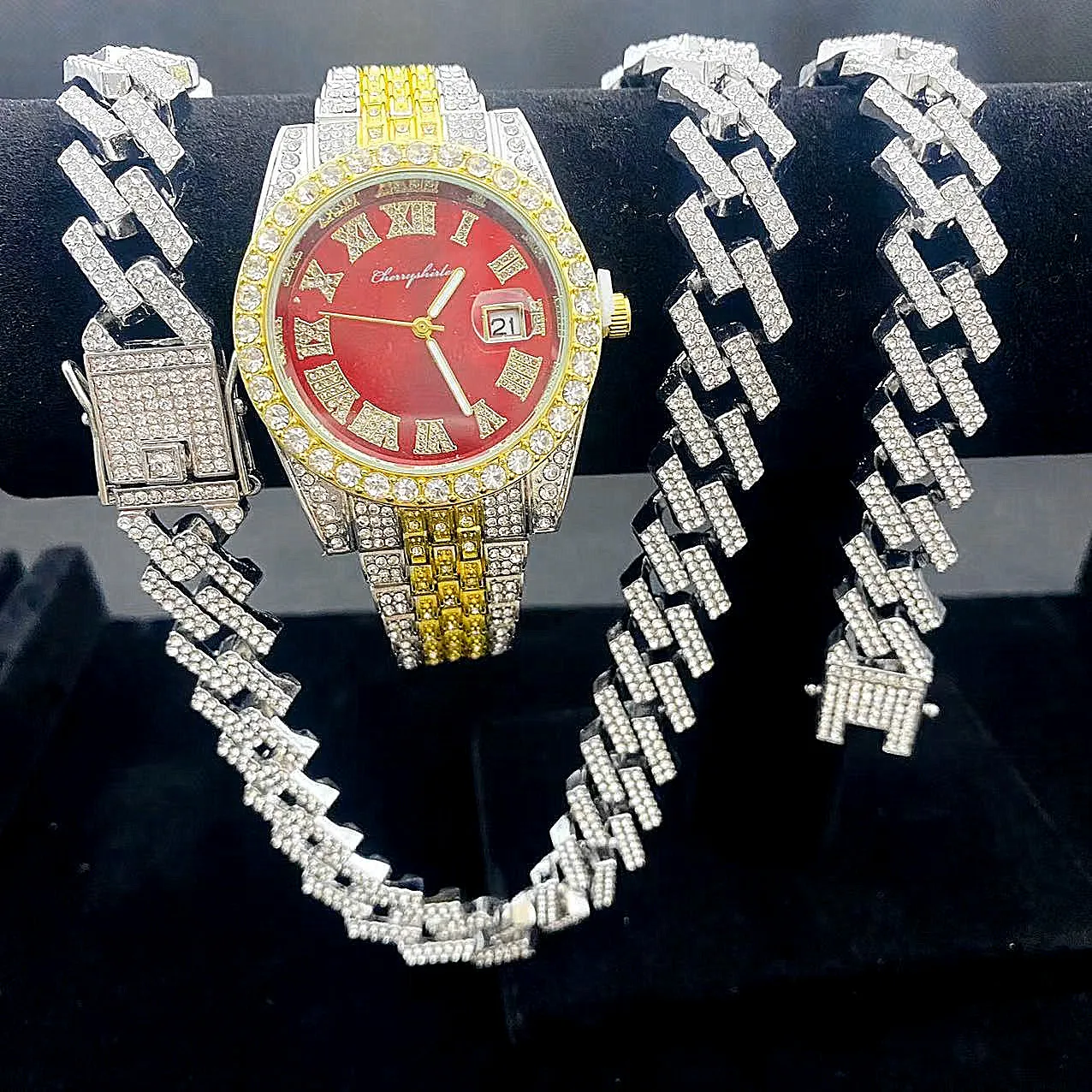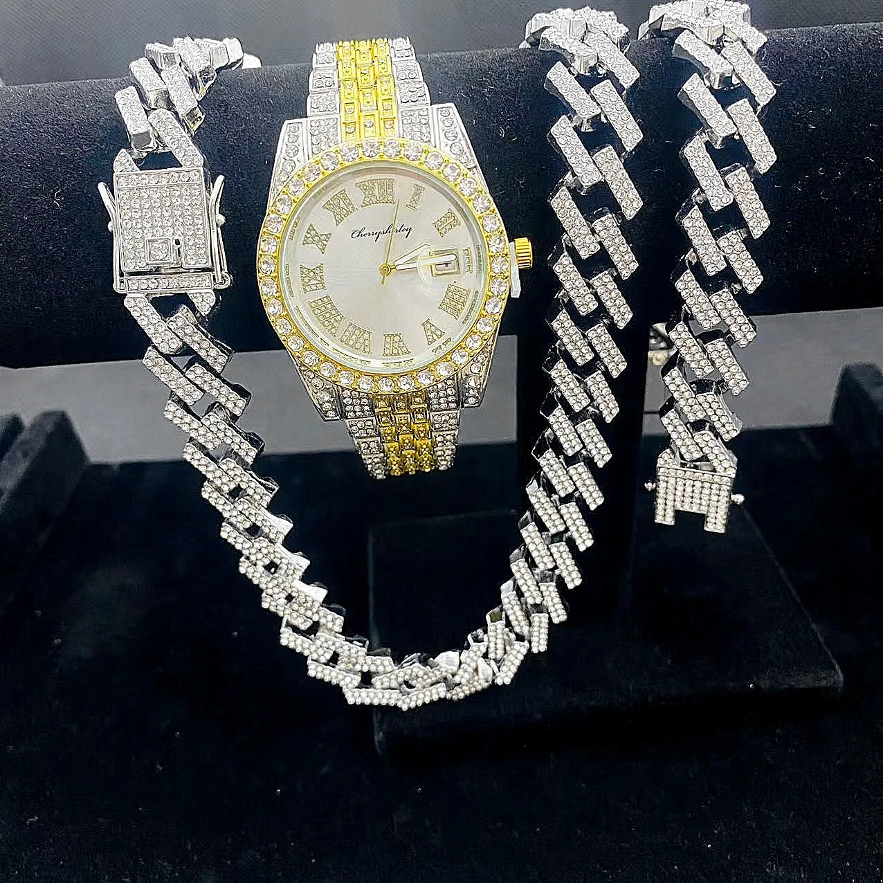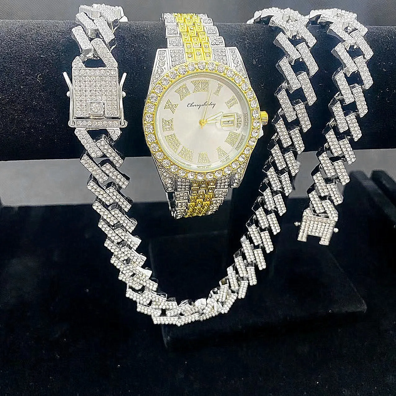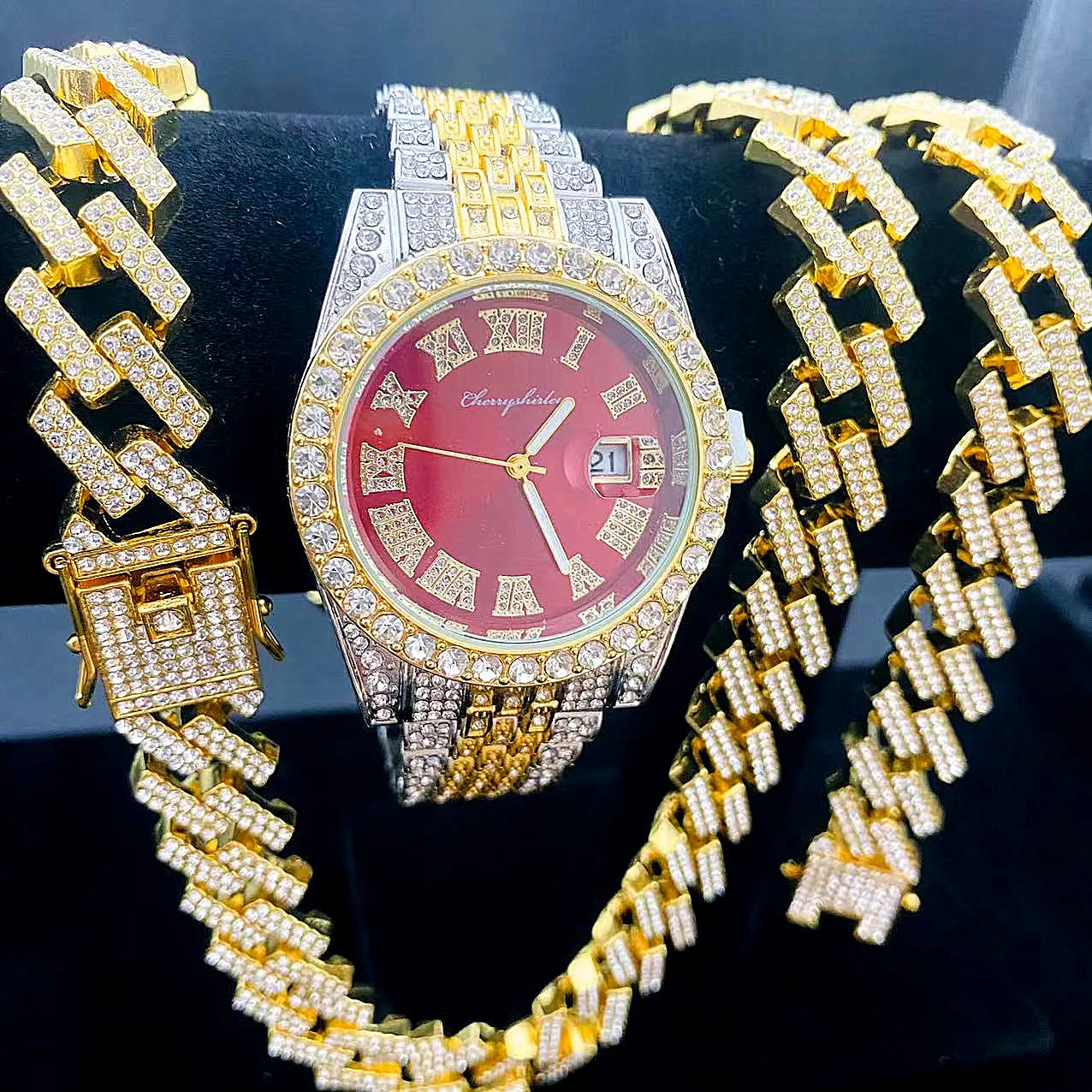3PCS Iced Out Watches for Men Diamond Gold Watch 15mm Cuban Link Chains Bracelet + Necklaces Jewelry Watch Men Religio Masculino