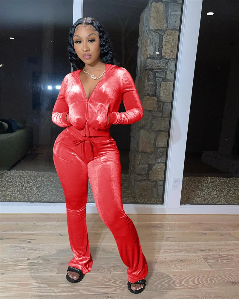 Autumn Winter Solid Velvet 2Piece Set Women Outfits Tracksuit Zipper Long Sleeve Hooded Sweatshirts Top Flare Pants Joggers Suit