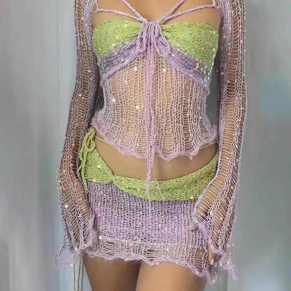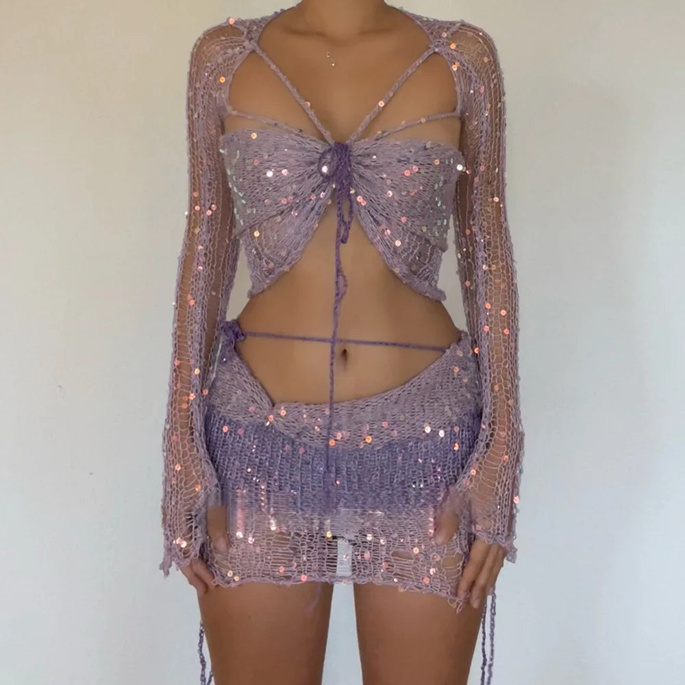 Crochet Knitted Dress Two Piece Skirt Sets 2023 Winter Women Clothes Sexy Crop Tops Elegant Knit Sequin Dress 2 Piece Set Outfit