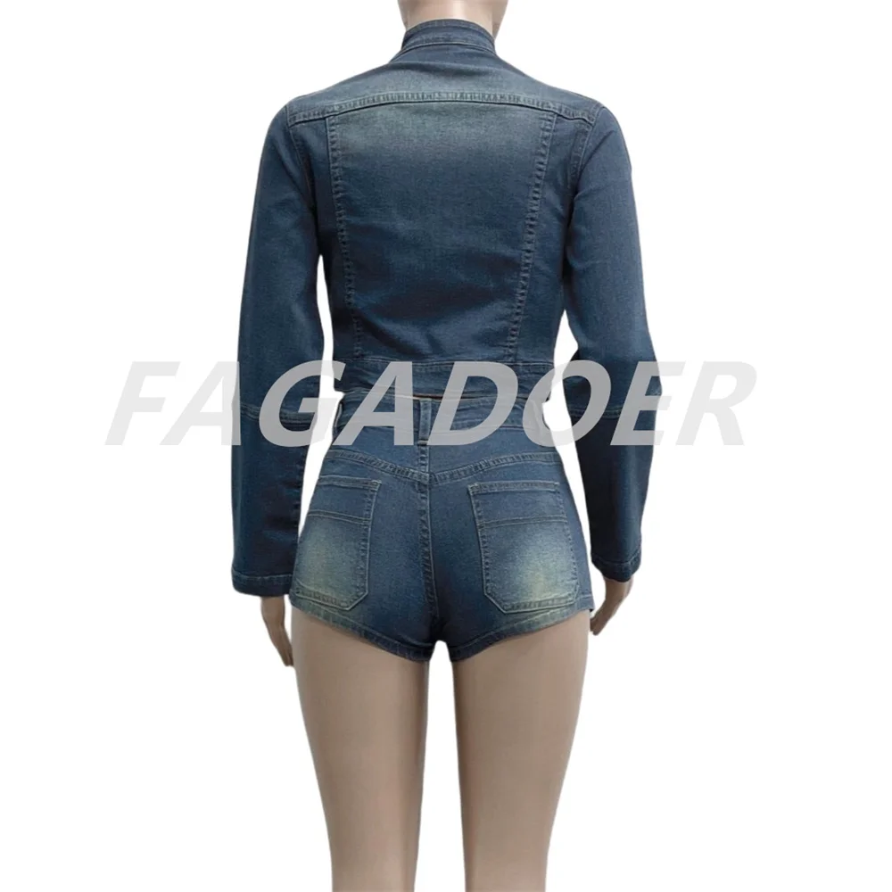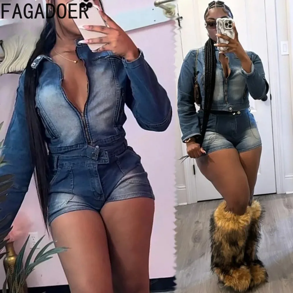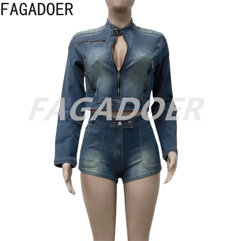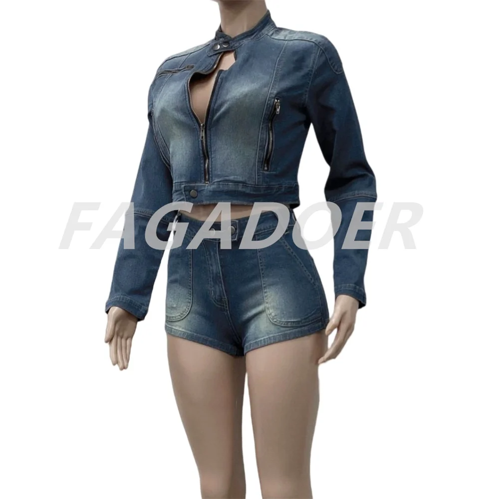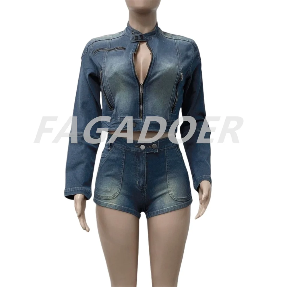 FAGADOER Retro Denim 2 Piece Sets Women Outfit Zip Crop Denim Jacket + Shorts Sets Stretchy Suits Female Streetwear Clothing