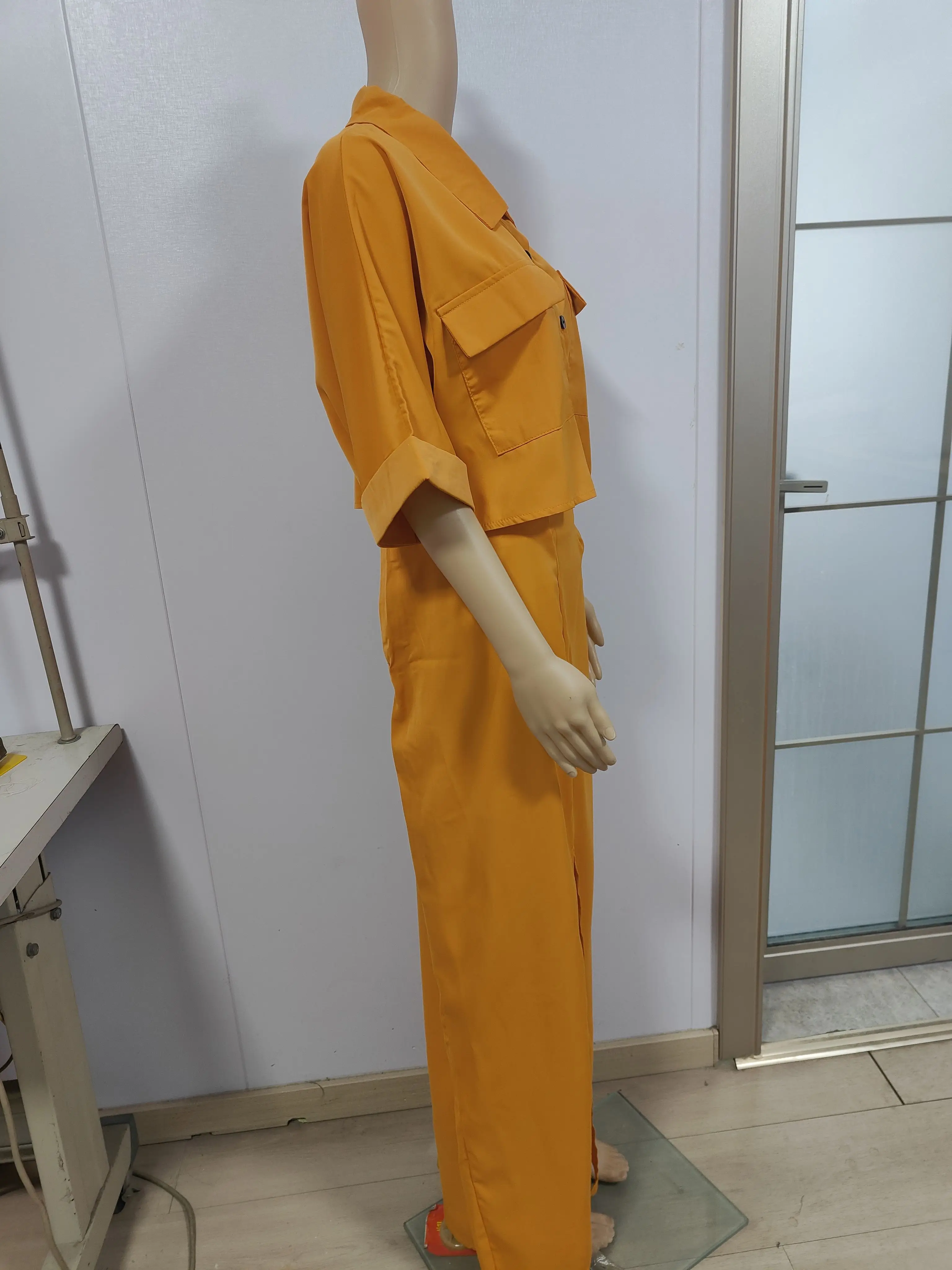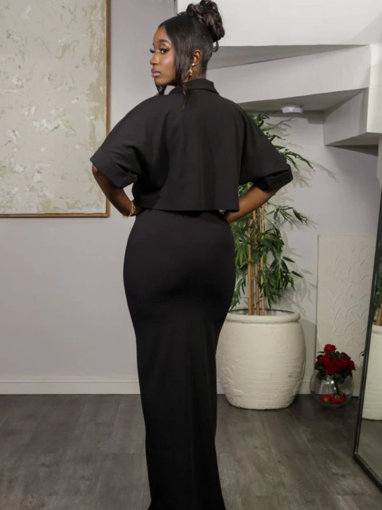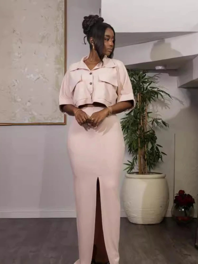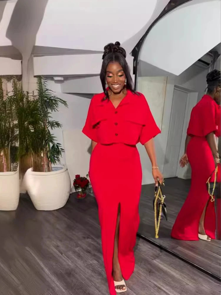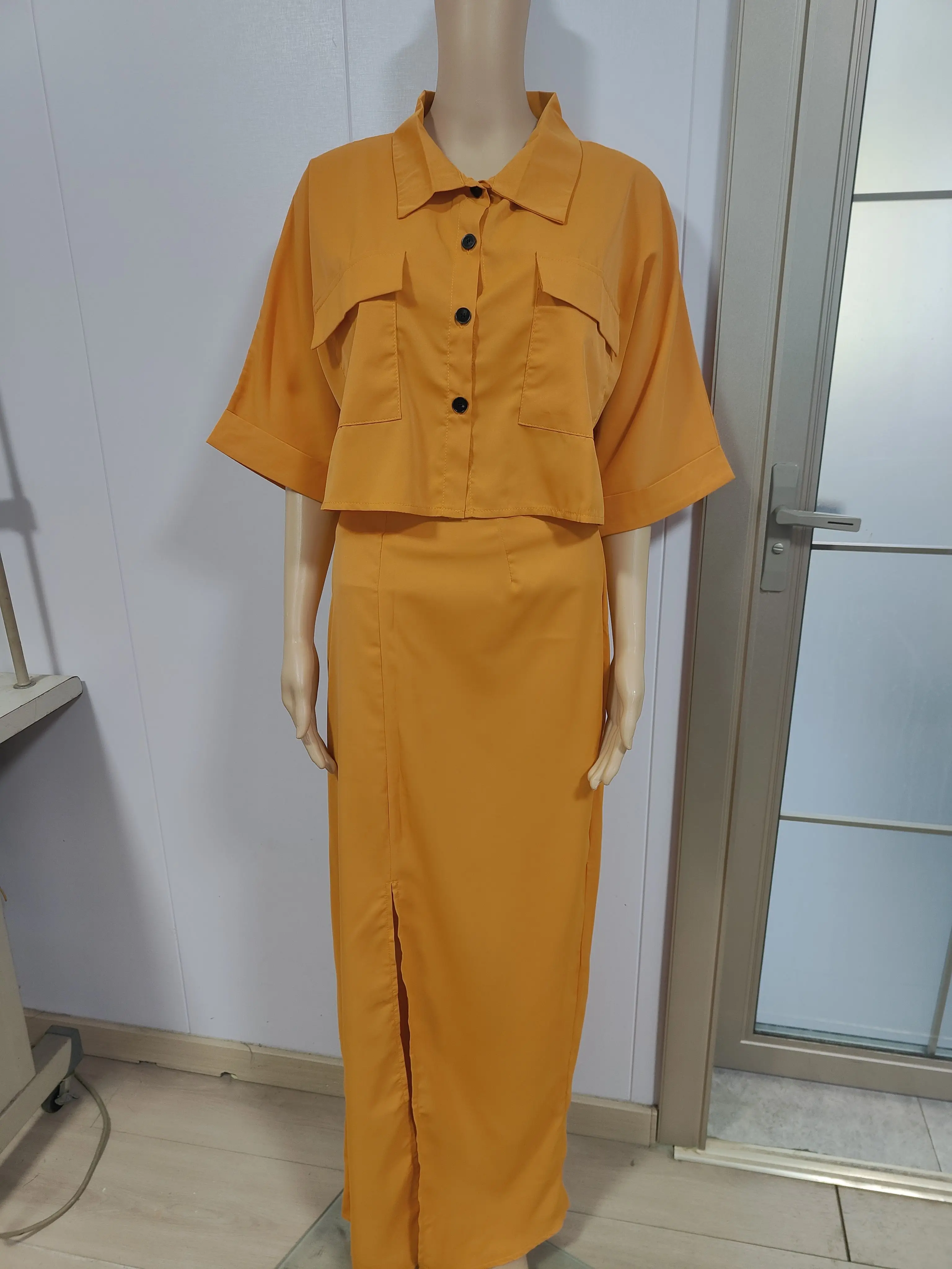 Fashion Casual Office Women Clothing New Summer Women Long Dress Set Lapel Solid Short Shirt Top Split Half Skirt 2-piece Set