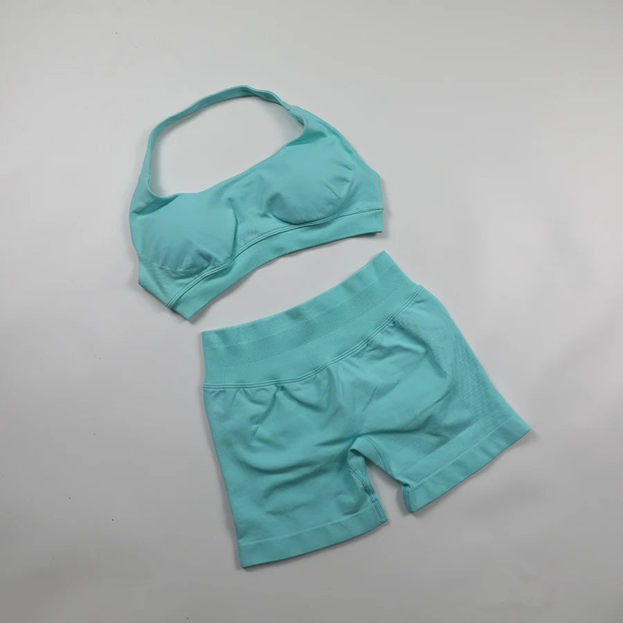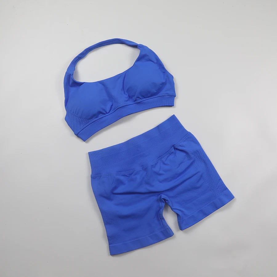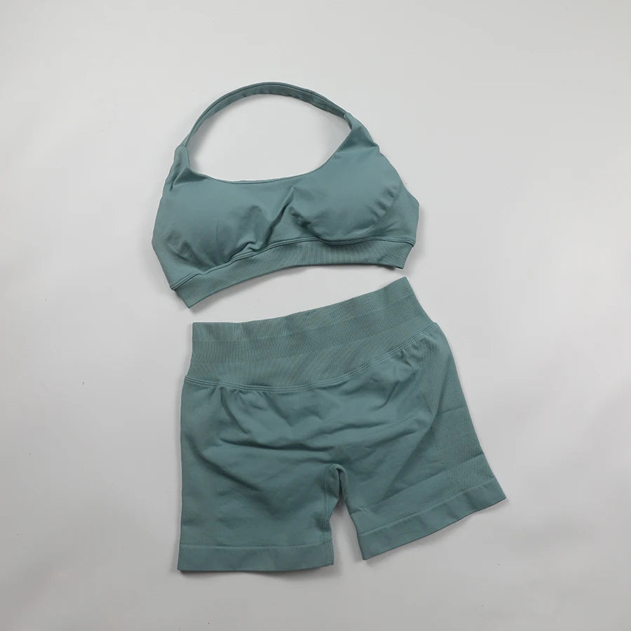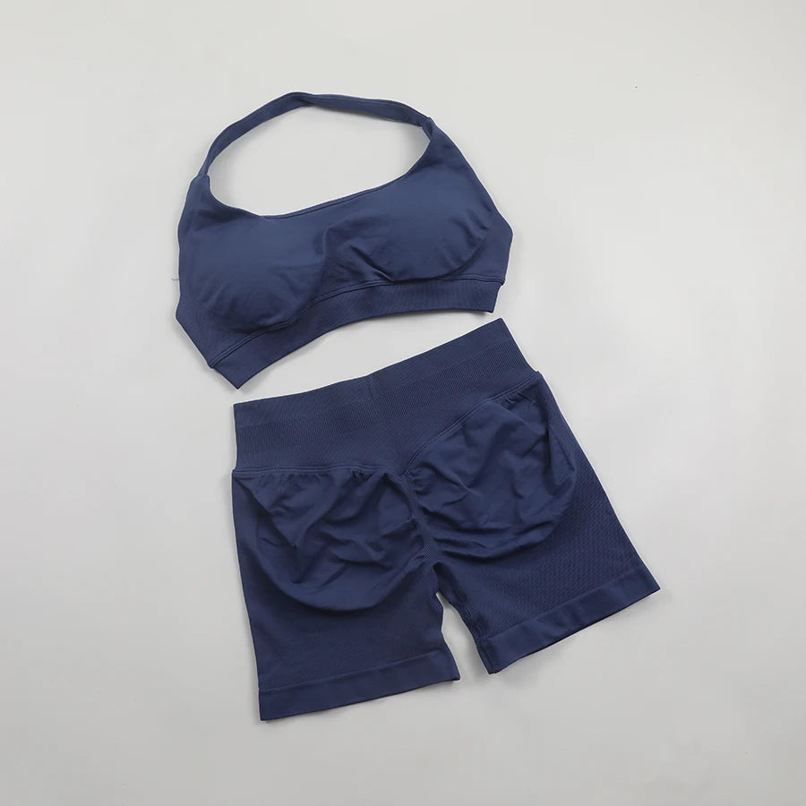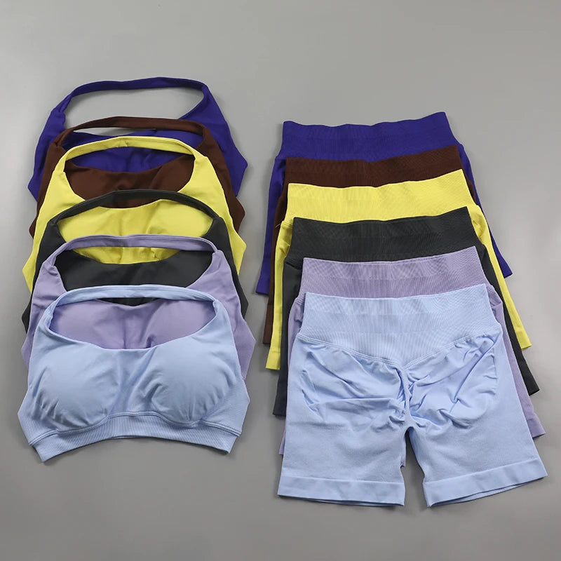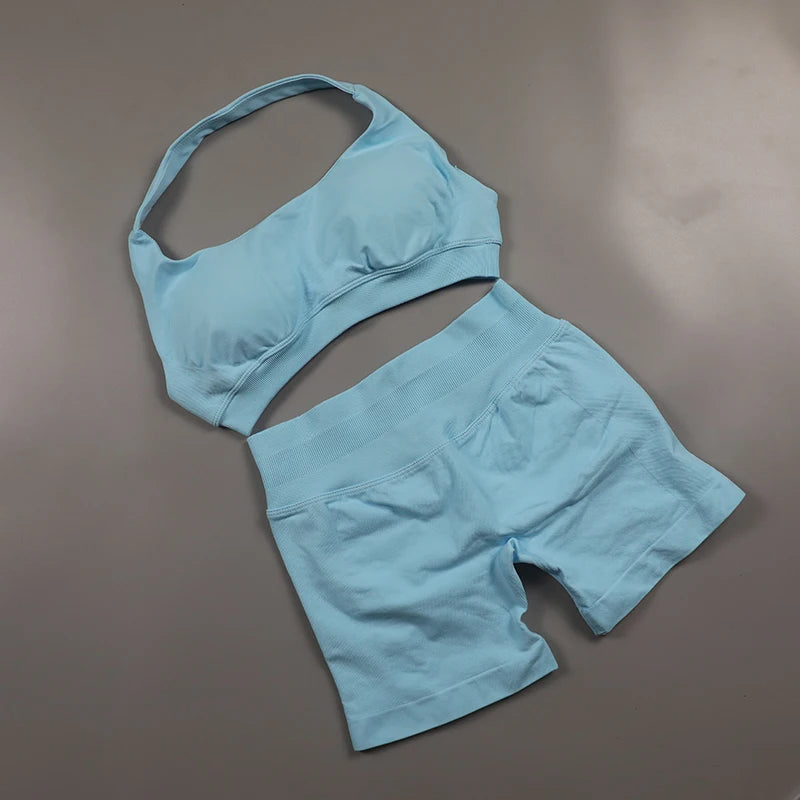Seamless Fitness Yoga Set Women Gym Clothes Halter Sports Bra Matching Impact Shorts 2 Piece Workout Sets Outfit