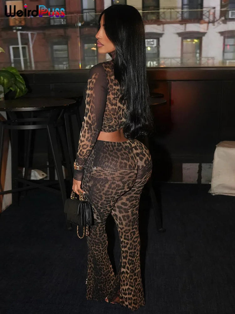 Weird Puss Sexy 2 Piece Set Women See Through Midnight Party Full Sleeve Crop Tops+Pants Matching Clubwear Skinny Autumn Outfits